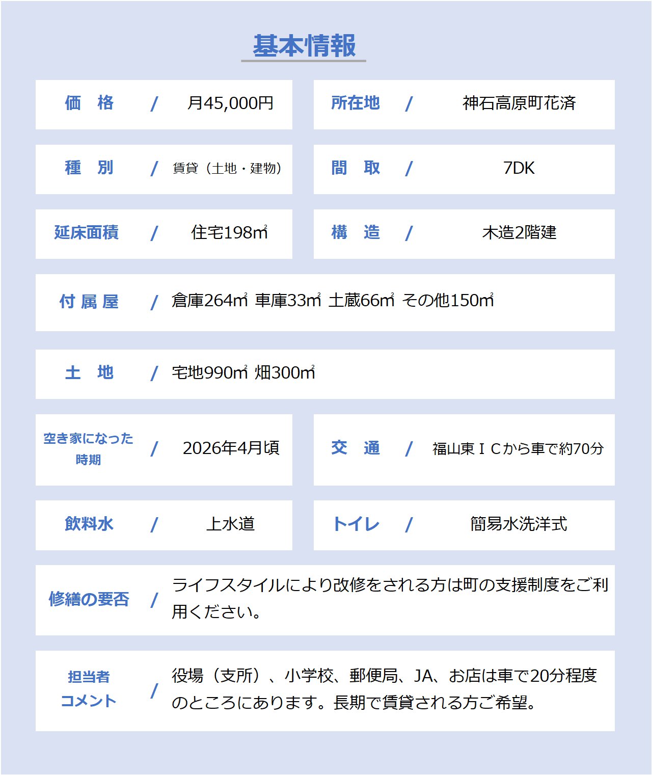 【所在地】広島県神石郡神石高原町花済 【種別】賃貸(土地及び建物)